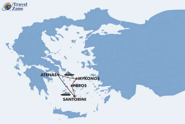 | Atenas, Mykonos, Paros, Santorini |